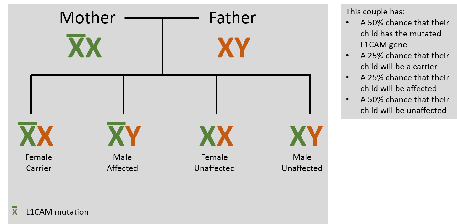 Females with one affected X chromosome are called ‘carriers’ and have less than a 5% chance of showing clinical symptoms. This is because females have a second, intact copy, of the L1CAM gene which is inherited from the father. A female carrier has a 50% chance of transmitting the affected gene to each child. Males with an affected X chromosome have L1 syndrome because the Y chromosome does not contain the L1CAM gene. Therefore, in males, all of the gene products are produced from the one affected L1CAM gene. The severity and type of symptoms are dependent on where and what genetic mutation is present.