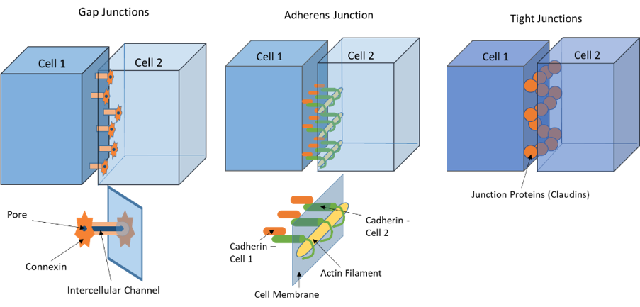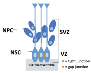 The neural stem cells (NSCs) make up the VZ and eventually differentiate into ependyma, the cells lining the ventricles. NSCs and ependyma are held together by different types of junctions. As a reminder, gap junctions use proteins called connexins and provide a channel for cell to cell communication when cells are close together but not physically touching each other. Adherens junctions use proteins called cadherins to anchor cells to one another by providing a stiff connection between the cells. Tight junctions use proteins called claudins that create a barrier that does not allow fluid to pass in between the two cells.
